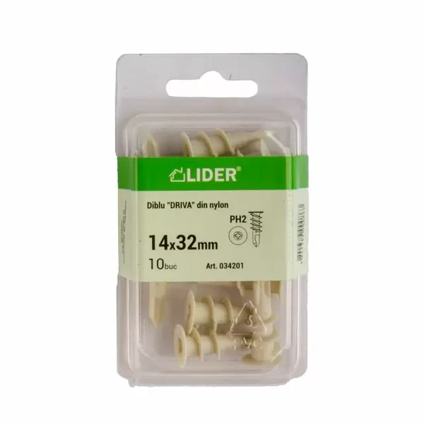 Diblu ”Driva”, din nailon este un element de fixare de înaltă calitate, special conceput pentru utilizarea în gips-carton și alte materiale de construcție moi. Fabricat din nailon durabil, acest diblu are o construcție unică care permite fixarea rapidă și sigură a elementelor fără a necesita găurire preliminară. Capul înecat asigură un aspect curat după instalare, făcând fixarea aproape invizibilă.