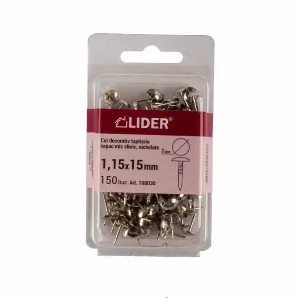 Cui decorativ cu cap sferic — este un element de fixare elegant, destinat să adauge un accent stilistic în interior sau în proiecte artistice. Capul sferic nu doar că oferă cuiului un aspect unic, dar facilitează și prinderea și manipularea atunci când este bătut. Aceste cuie sunt adesea utilizate pentru fixarea decorativă a țesăturilor, pielei și altor materiale moi pe suprafețe de mobilier, precum și pentru crearea de panouri decorative și instalații artistice.