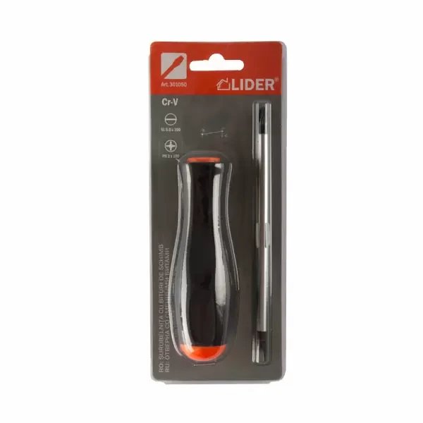 Șurubelniță cu duze de schimb este un instrument universal pentru efectuarea unei game largi de lucrări. Șurubelnița este echipată cu două vârfuri: unul cu cap Phillips nr. 2 (PH2) de 100 mm și un altul cu cap plat de 5,0 mm (SL5,0) de asemenea 100 mm lungime. Vârfurile sunt fabricate din oțel crom-vanadiu (CrV), ceea ce le asigură o rezistență mare, rezistență la uzură și durabilitate. Sistemul de interschimbare a vârfurilor permite o adaptare ușoară la diferite sarcini, făcând instrumentul deosebit de util în condiții care necesită flexibilitate și eficiență.